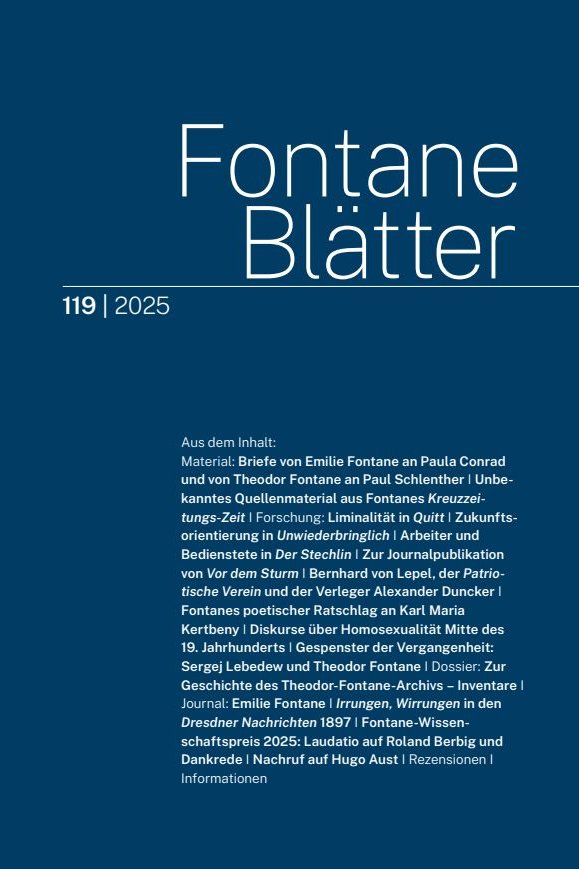 Alle 60 Jahrgänge der seit 1965 erschienenen Fontane Blätter sind in Kooperation mit der Universitätsbibliothek Potsdam retrodigitalisiert worden und können ab sofort auf dieser Website oder auch auf dem Portal Digitales Brandenburg kostenfrei eingesehen, durchsucht und als PDF im Open Access heruntergeladen werden.